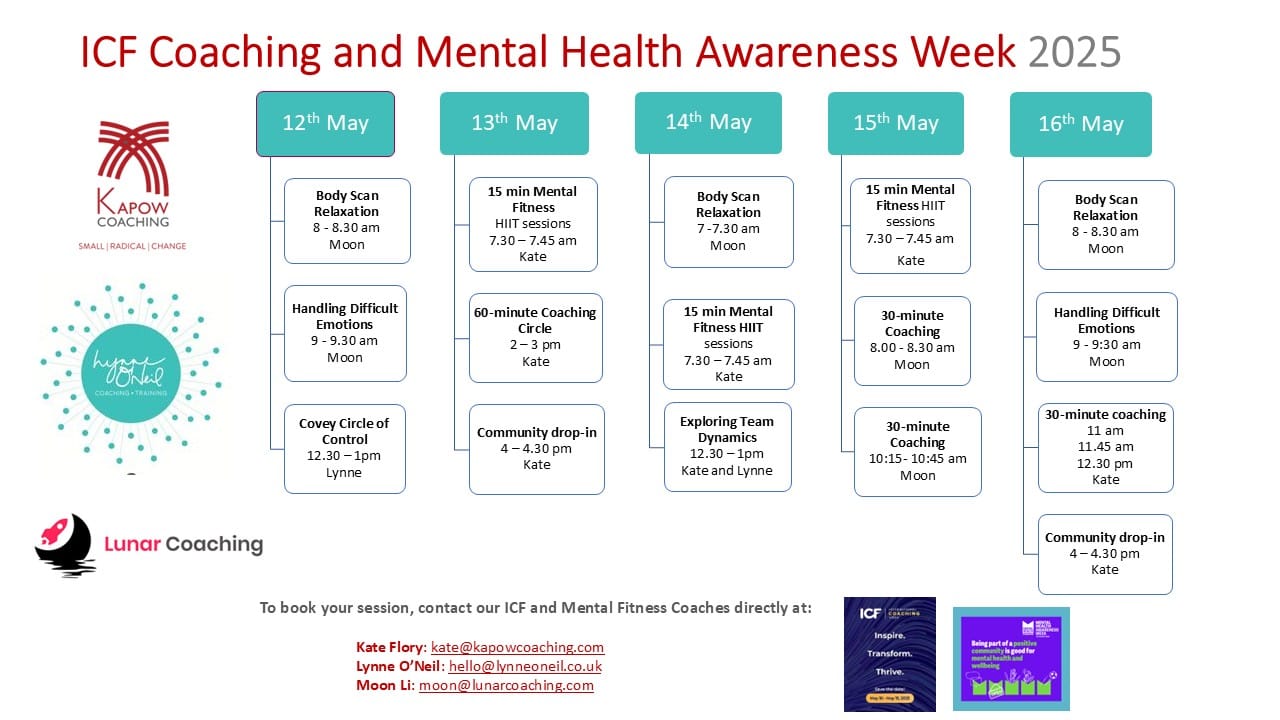 Kapow Coaching is delighted to be taking part in the International Coaching Federation Coaching Week and the Mental Health Foundation Wellness Week – all next week from 12th to 16th May.